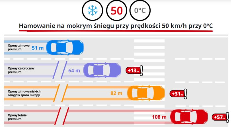 Badania porównawcze opon całorocznych i zimowych, klasy budżetowej i opon niskich osiągów – przeprowadzone we współpracy z Polskim Związkiem Przemysłu Oponiarskiego (PZPO), Politechniką Rzeszowską oraz firmą rzeczoznawczą Auto-Test – wykazały, że samochód na oponach zimowych budżetowych sprawdzonych producentów zahamował po 28,5 metra, podczas gdy w takich samych warunkach opony niskich osiągów potrzebowały aż 38,5 metra, czyli 10 metrów dalej!