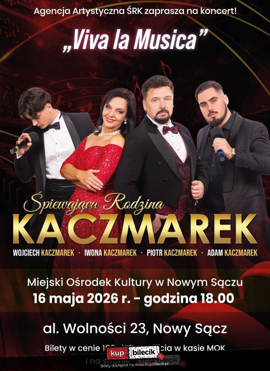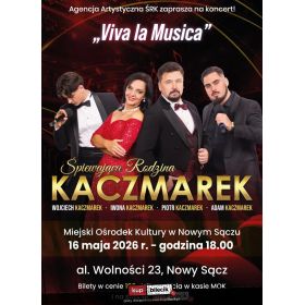 bilety: "Viva La Musica" to zupełnie nowy koncert jedynej w Polsce rodziny śpiewającej muzykę klasyczną. W wykonaniu Śpiewającej Rodziny Kaczmarek usłyszycie państwo tym razem najpiękniejsze melodie z operetki min. Wesołej wdówki, Hrabiny Marizy, Księżniczki Czardasza, czy Guditty, przeboje z musicali min: Skrzypka na dachu, My fair lady czy Upiora w operze, a także piękne standardy muzyki rozrywkowej, piosenki z repertuaru Franka Sinatry Elvisa Presleya, Poula Anki czy Luisa Armstronga. Śpiewająca Rodzina Kaczmarków artyści: Iwona Kaczmarek, Piotr Kaczmarek, Wojciech Kaczmarek, Adam KaczmarekŚpiewająca Rodzina Kaczmarków - dobrze znana w całej Polsce. Koncertują razem od 4 lat. Adam i Wojtek dali się poznać szerokiej publiczności po występie w programie Mam talent, odnosząc tamże ogromny sukces. Adam Karczmarek to również gość Festiwalu Piosenki Krajowej w Opolu. Bilety do nabycia na: KupBilecik.pl |
